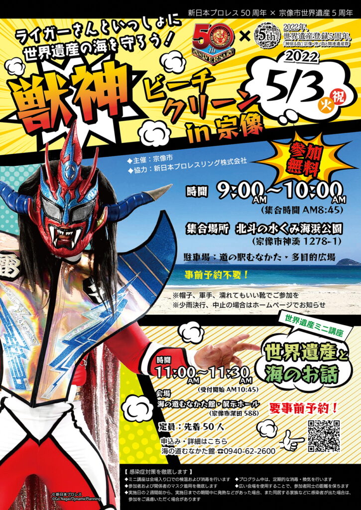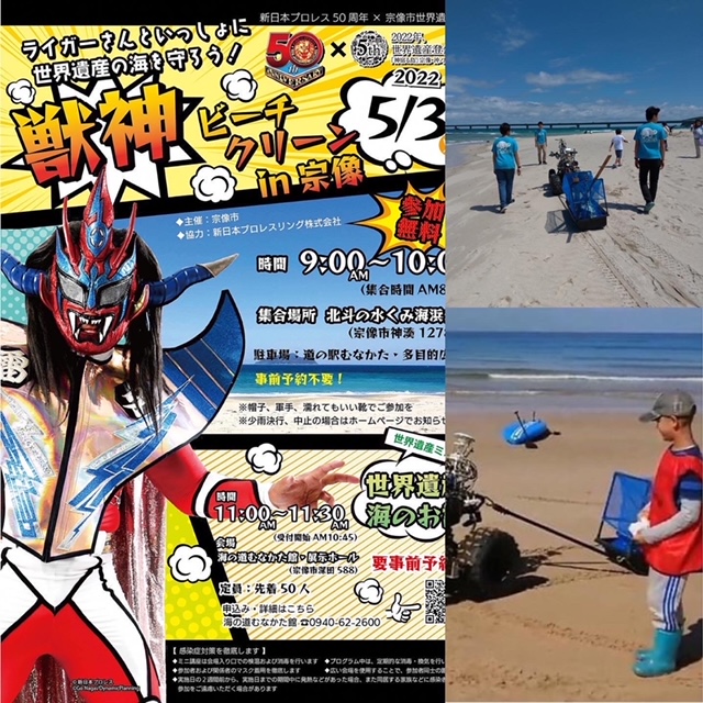 世界遺産の「『神宿る島』宗像・沖ノ島(おきのしま)と関連遺産群」が、登録から5年を迎えます。海の環境問題について考えてもらおうと海岸の清掃活動が行われました。清掃活動のメンバーとして宗像市のさつき松原海岸に現れたのは、元プロレスラーの獣神(じゅうしん)サンダーライガーさんです。世界遺産への登録5周年と新日本プロレスの旗揚げ50周年を記念して活動に参加しました。海岸では家族連れなど約100人の市民が色んなごみを一つ一つ手で拾って専用の袋に入れました。