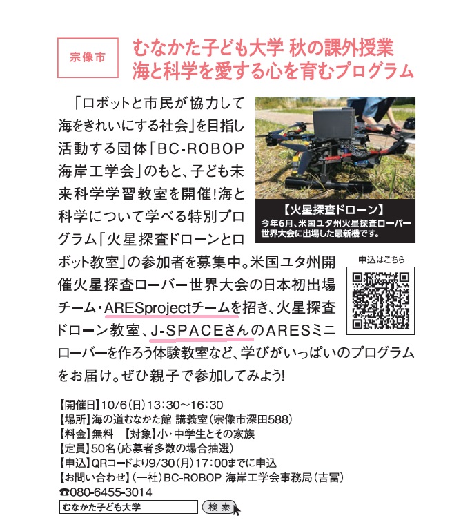 一般社団法人BC-ROBOP海岸工学会は海と科学を愛する心を育むプログラムとして「むなかた子ども大学 秋の課外授業~子ども未来科学学習教室~」を宗像で開催。小・中学生と一緒に火星探査ドローンについて学び、ミニローバーを作るロボット教室を行いました。